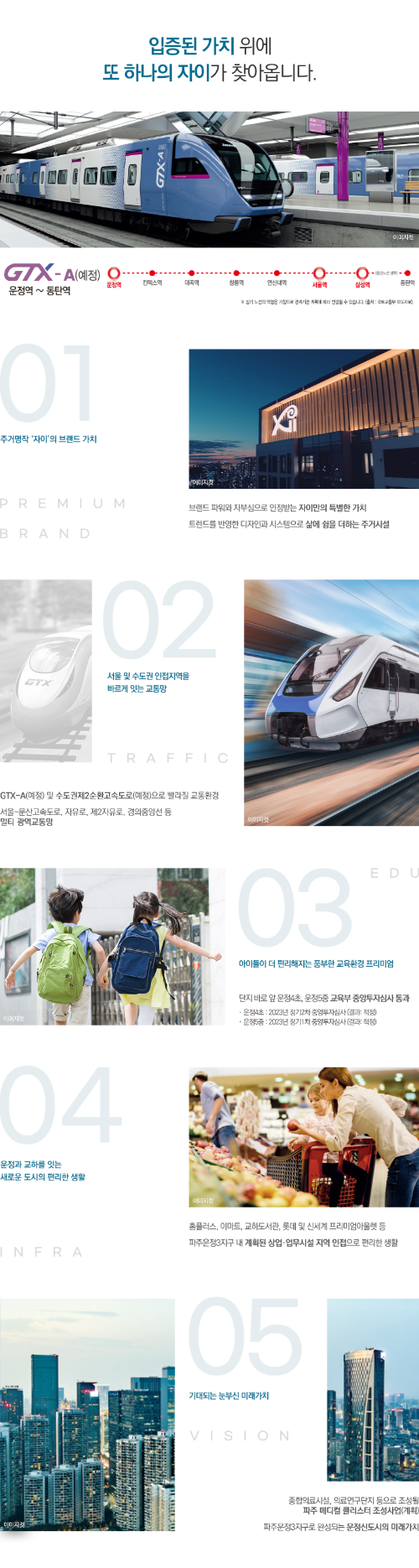 입지 특징으로는 수도권 광역급행철도A(GTX-A) 노선을 주목할 만합니다. GTX-A 노선 운정역(이름 미정)이 단지 인근에 조성될 예정인 만큼 우수한 서울 접근성을 기대할 수 있습니다. 내년 하반기 부분개통을 목표로 GTX-A 노선 운정역 ~ 서울역 구간 공사가 진행 중입니다. 업계에 따르면 해당 노선 개통 시 운정역에서 서울역까지 걸리는 시간은 약 18분입니다. 다른 교통망으로는 서울 ~ 문산 고속도로와 자유로, 제2자유로 등의 진입이 용이합니다.