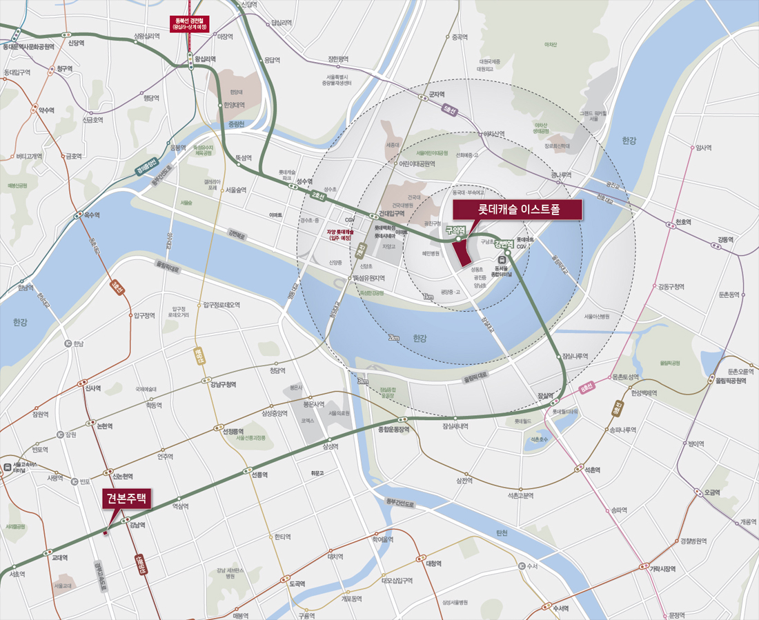 구의역 롯데캐슬 이스트폴의 가장 큰 장점은 2호선 구의역 초역세권 단지로, 강남은 물론 서울 전역으로 이동이 편리하고 잠실대고, 강변북로, 올림픽대로 등 뛰어난 도로교통망을 갖추고 있다는 점입니다. 또, 인근에 동서울종합터미널도 위치하고 있어 외곽 지역으로 이동하기롣 쉽습니다.