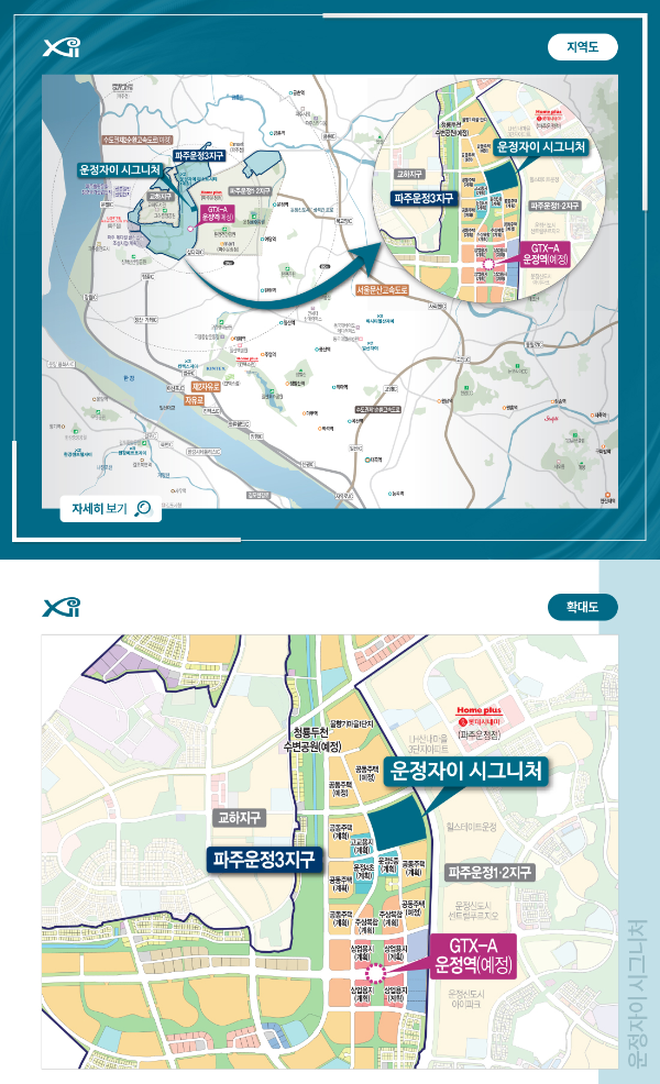 인근에는 홈플러스와 이마트 등 대형마트가 있습니다. GTX-A 운정역 주변은 역세권 특별계획구역을 통해 상업, 업무, 공원, 문화시설 등이 조성될 계획이 있습니다. 단지에서부터 운정호수공원까지는 산내공원, 운정건강공원 등 공원이 자리했습니다.